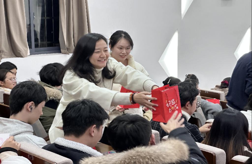 马丽充分肯定了考研学子们的辛勤付出,并向同学们表达真挚祝福与殷切希望。在送大礼包环节中,学院为考研学子送上内水果卡、好运贺卡等物品的“考研加油礼包”鼓励同学们调整好心理和身体状态,沉着冷静备考。