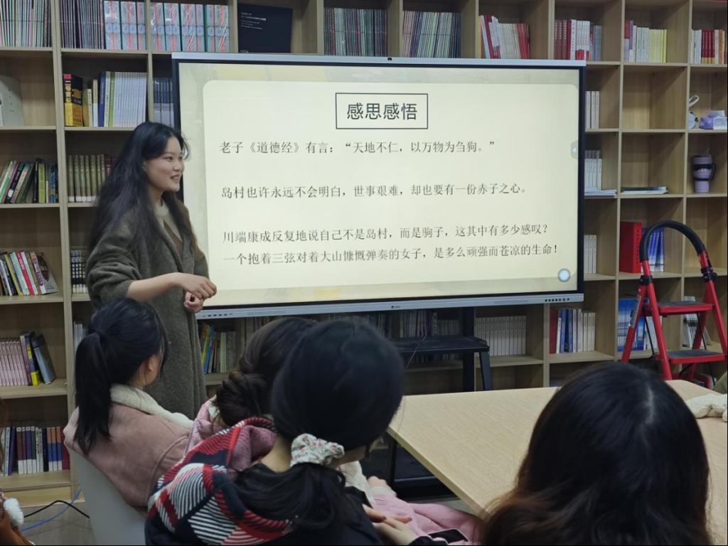 本期分享会中,汉语言2201班的黄雯静以“雪国之美源流”为题,为大家深入讲述了作者的生平经历及其创作《雪国》时的相关情况,让同学们更全面地去理解这部作品。她深入剖析《雪国》的故事内容,为大家再现书中描绘的雪国世界。黄雯静同学还对驹子、叶子等主要人物进行了细致入微的解读,展现了人物性格的多面性与复杂性。