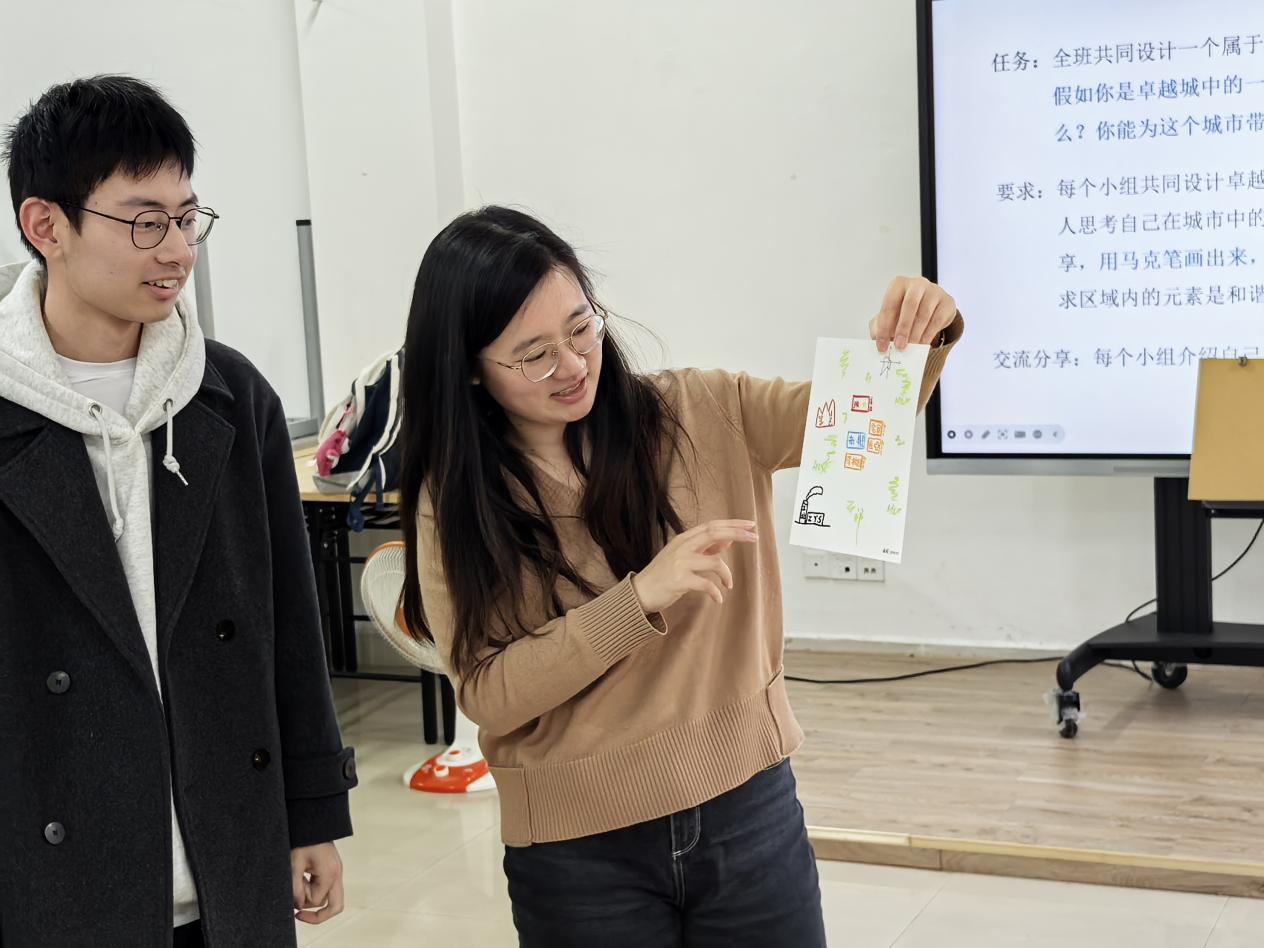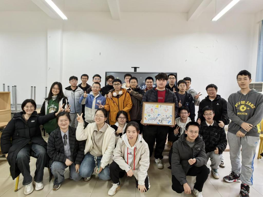 活动伊始,曾玮怡通过方言接龙游戏,帮助同学们快速破冰、建立信任、缓解紧张情绪。同学们通过抽取卡牌随机分为四组后,三个精心设计的游戏环节接连进行。“姓名大作战”游戏中,每两组间互相比拼,通过抢答方式说出对方的籍贯加姓名促进相互关系,欢快的气氛让同学们迅速拉近距离。在“你画我猜”的游戏中,每组派代表用肢体语言演绎抽象数字,队友协作破解谜题,两两对决的赛制激发了同学们的参与热情,夸张的表演与默契的配合将活动推向高潮。“共筑卓越城”环节,各小组围绕“卓越”主题,用画笔自由创作城市蓝图,充分展现同学们的多元创造力。最后画作被拼接为完整的“卓越城”巨幅画卷。色彩交织的图景象征着个体力量与团队精神的融合,赢得现场热烈掌声。