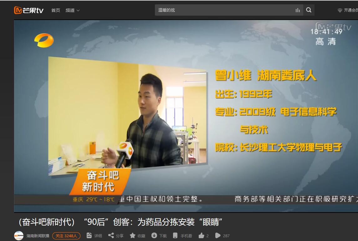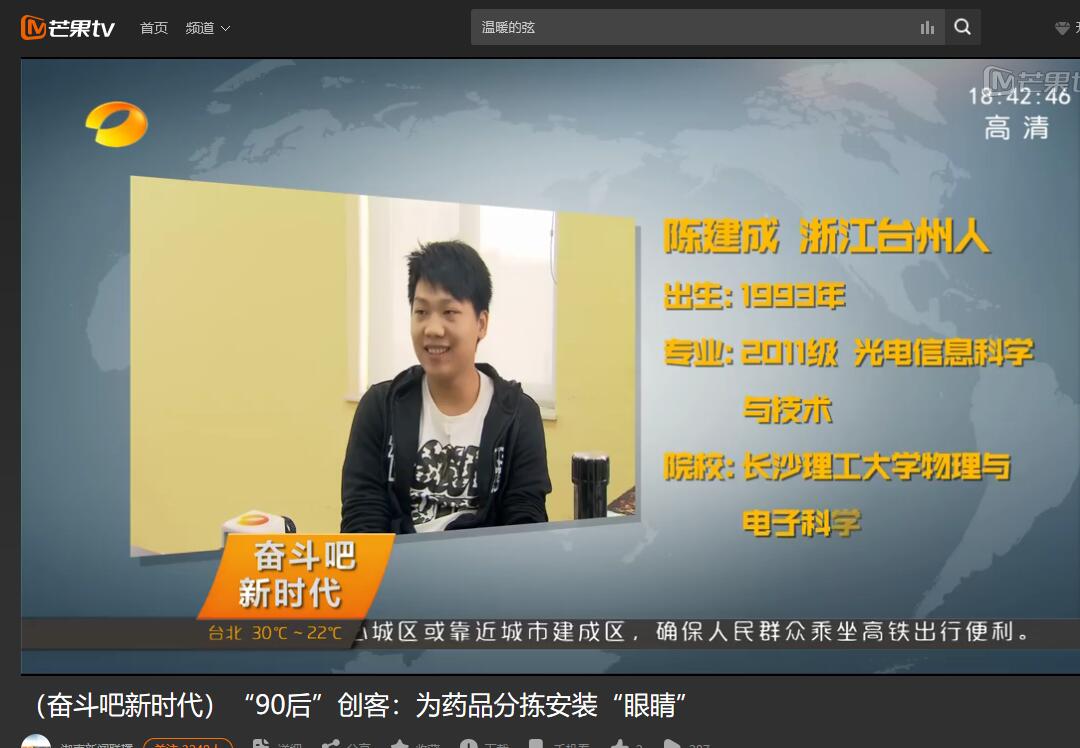 湖南卫视2018年5月8日新闻联播,报道了304永利集团官网入口物理与电子科学学院3名毕业生的创新创业故事,曾小维、刘浪和陈建成分别是304永利集团官网入口13、14、15届毕业生。大学期间,他们都是学院创新团队成员,曾获全国大学生电子设计大赛一等奖。2016年,开始借助机器视觉技术开发出计数和检验系统,能高精度、高速度完成散装产品(药片或胶囊)的外观合格检测和产品计数,技术填补了国内市场空白。