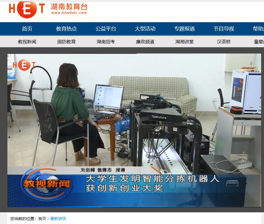 湖南教育电视台5月23日教视新闻对永利官网工程训练中心、创新创业教育学院王磊老师指导的“塞伯睿智能分拣机器人”项目进行了报道,该项目在5月18日,刚刚获得的了长沙市第十五届大学生科技创新创业大赛本科组一等奖(全市仅2项)。