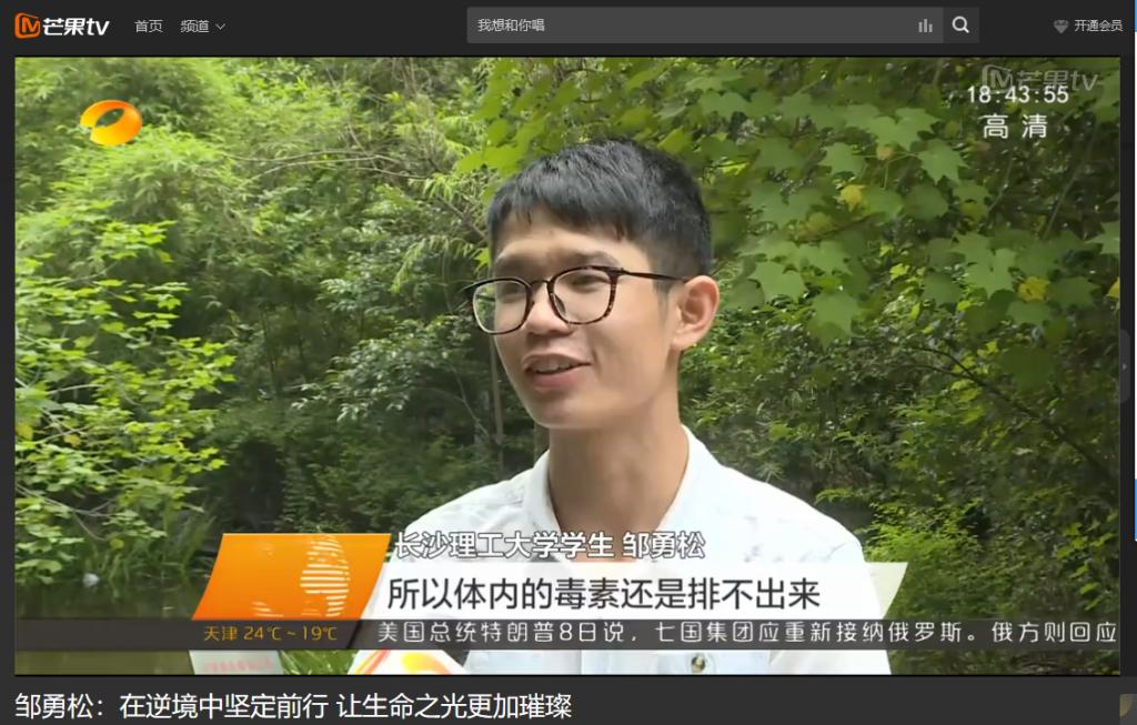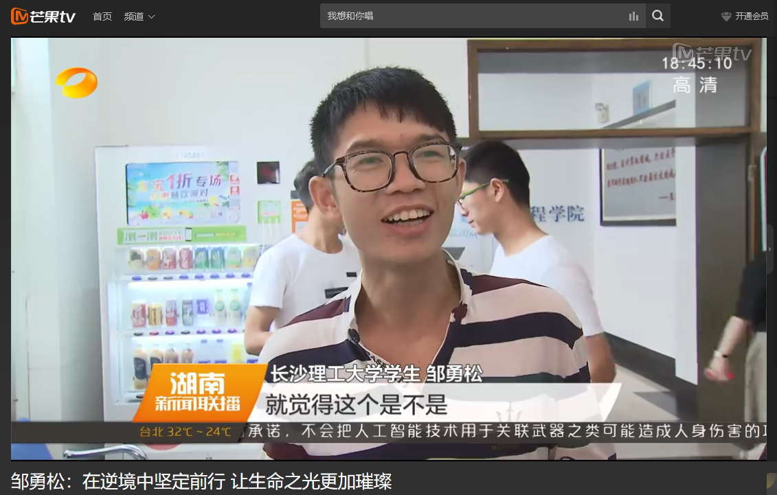 湖南卫视 6月9日新闻联播,以《邹勇松:在逆境中坚定前行 让生命之光更加璀璨》为题对永利官网计算机与通信工程学院15级研究生邹勇松进行了报道。