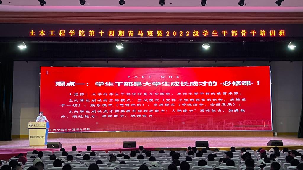 为贯彻落实全国教育大会精神,进一步加强学生工作队伍建设,提高工作能力和水平,10月3日,土木工程学院在金盆岭校区五教大礼堂举办第十四期青马班暨2022级学生干部骨干培训班。学生工作办公室主任李小军老师及文明养成与学风督导负责人戈畅主讲。2022级年级组全体成员、全体班委和院学生会干事、寝室长参加培训。2022级辅导员林安妮老师主持会议。