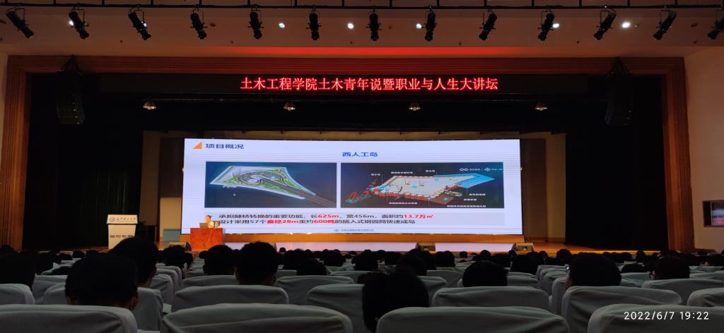 6月7日晚上,土木学院在金盆岭校区五教大礼堂举办第五期“土木青年说”暨职业与人生大讲坛,主题为“用不懈奋斗书写青春永不褪色的华美篇章”。学院2010届优秀校友、中交一航局三公司总工程师杨润来应邀主讲。院党委副书记黄阿明、2021级辅导员邓文杰以及全体2021级研究生和本科生900余人参加本次讲座。讲座由土木2109班卢宇轩主持。