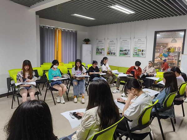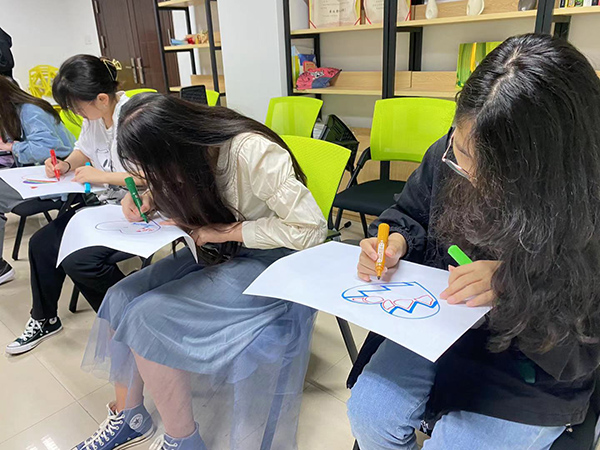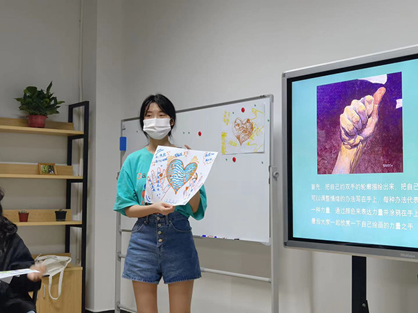 活动开始,在阿尔法脑波音乐的旋律中,同学们闭上眼睛进行冥想,回想最近的好情绪与坏情绪。接着,张培瑶让同学们在白纸上画出一颗爱心,并且需要不同色彩、调整面积等表达形式填充,以爱心来反应冥想的情绪。画完爱心,同学们仔细观察自己所画内容并思考自己近期的不好情绪与这些压力来自何处。然后,张培瑶用击鼓传花的方式让同学们讲出自己处理负面压力和情绪的方式。最后,秦子玲结合了“情绪ABC理论”对如何处理负面情绪进行了总结。