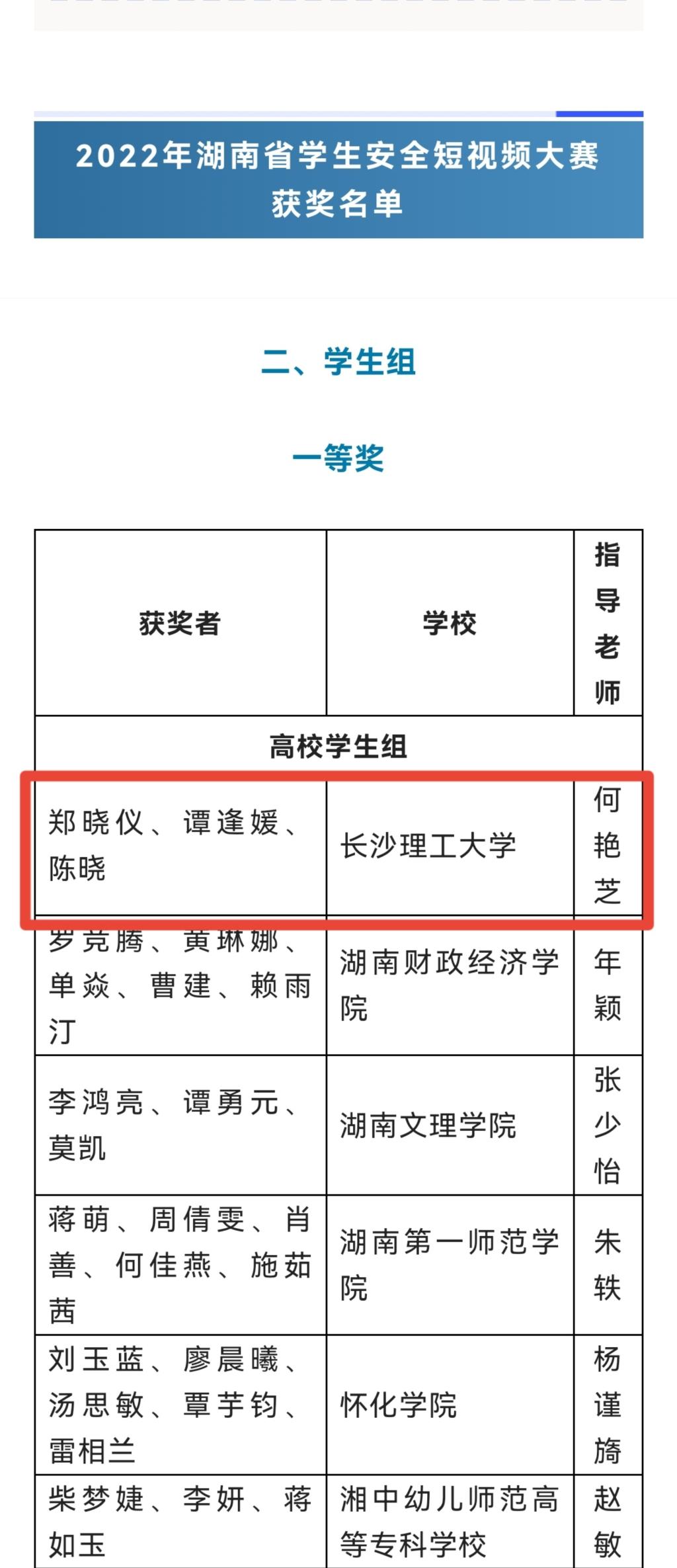 经管学院学生在湖南省教育厅举办的2022年湖南省学生安全短视频大赛中荣获高校组一等奖,获奖学生为金融1903班郑晓仪、谭逢媛、陈晓3名学生,指导老师是2019年级辅导员何艳芝。该项比赛共收到1053件作品,通过网络投票、专家评审等环节进行评选。