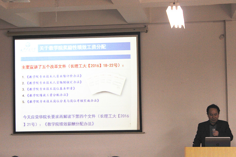 黄立宏强调了学校通过人事制度改革充分挖掘教师教学、科研工作积极性的必要性和迫切性,对2017年学校人员经费发放情况、教学院专业技术岗位分类与岗位考核实施办法、奖励性绩效工资分配等进行了详细解读,希望学院全体教职工为学校“双一流”建设及实现“百强梦”贡献力量。
