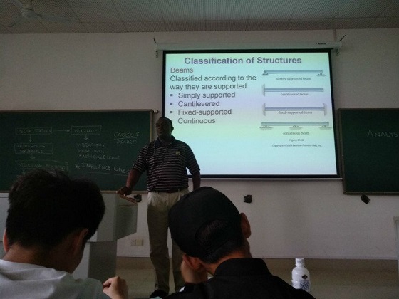 该批引进课程共计四门,分别是2015级第十一、十四门引进课程Fluid Mechanics与Special Topics in Engineering,2016级第六、七门引进课程Structural Analysis I与Transportation Engineering I,由来自UTC的Joseph Onyango Owino教授、Fomunung Ignatius Wobyeba教授、Baoshan Huang教授和Jidong Yang副教授承担,采用英文原版教材,全程英文授课。四门引进课程开课前,学生已在交通、土木和水利学院选派导读教师的带领下完成了12学时的导读课程学习。在为期三周的学习期间,学生将接受高强度的学习任务,并完成2次小考和1次大考。
