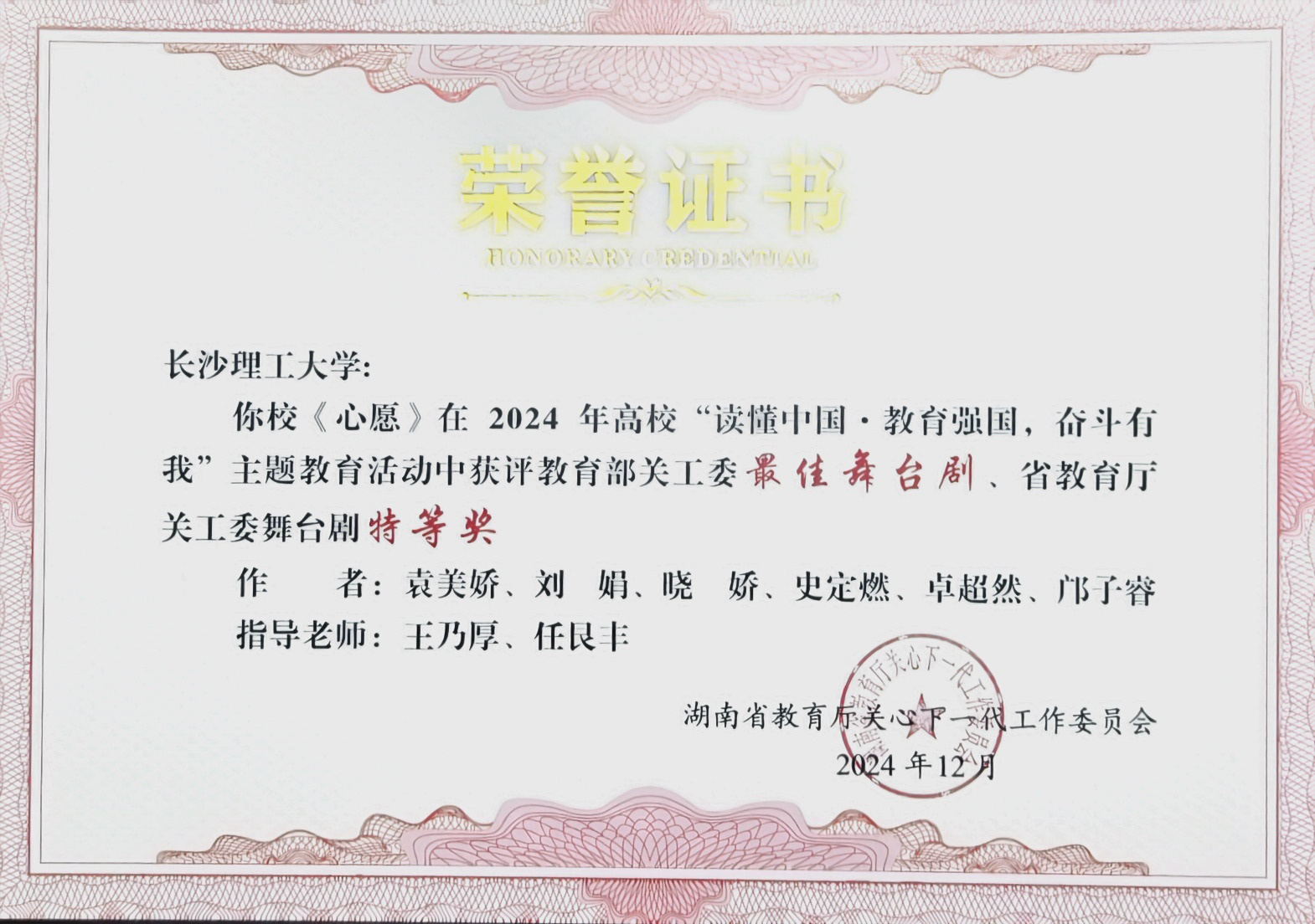 近日,教育部关工委和湖南省教育厅关工委相继公布2024年“读懂中国”活动入选作品名单,永利官网报送的舞台剧《心愿》荣获教育部最佳舞台剧(全国排名第1)和湖南省教育厅舞台剧特等奖,征文《举灯人》荣获教育厅征文一等奖,永利官网关工委同时荣获教育部及教育厅“优秀组织奖”。