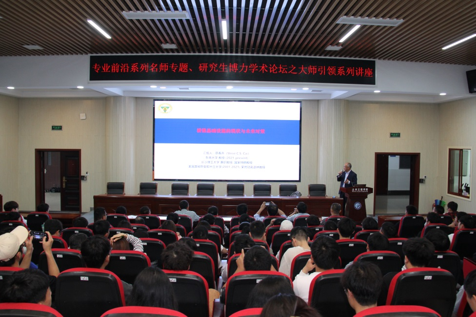 蔡教授首先指出,桥梁是交通基础设施的关键节点与城市地标,但是既有桥梁结构存在老化等诸多病害问题,尤其是在其长期任职的美国;同时指出,中国在20~30年后将面临同美国桥梁基础设施类似的老化问题。接着,蔡教授从新技术及新思维的角度提出了针对桥梁结构老化病害问题的解决对策,主要包括:建立桥梁健康监测系统、创新桥梁性能预测与评估方法、应用新材料与新结构、发展智能交通系统等。其中,对智能桥梁及智能建造的实现途径和方法进行详细的阐述;最后,蔡教授简要介绍了中国与美国教育系统的区别以拓宽同学们的世界视野,并为准备出国留学的同学提供了一些建议。