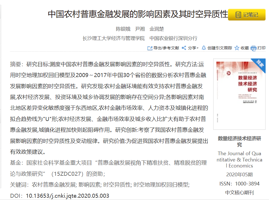 2020年5月,永利官网经管学院2018级应用经济学硕士研究生尹湘(第二作者)与导师陈银娥(第一作者)合作的论文《中国农村普惠金融发展的影响因素及其时空异质性》在权威期刊《数量经济技术经济研究》(2020年第5期)发表,是该院提高研究生培养质量的重要成果之一。