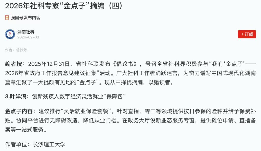 叶洋滈副教授聚焦新业态残疾人从业者权益保障与就业便利,建议创新残疾人数字经济灵活就业“保障包”:推行“灵活就业保险套餐”,面向直播、零工等领域开发按日参保的险种并给予保费补贴;协同相关平台开展无障碍改造,切实降低从业门槛;在政务大厅设立新业态服务专窗,提供摊位申请、直播备案等“一站式”服务。该建议体现了对数字经济新趋势和民生保障新需求的敏锐把握,为增强新就业形态残疾人群体获得感、幸福感提供了制度创新方案。