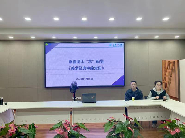 中央电视台百集特别节目《美术经典中的党史》从中国共产党成立以来各个历史时期,遴选出100件最具代表性的作品,再现中国共产党成立100年来波澜壮阔的光辉历程。特邀党史和美术专家讲述美术作品背后的党史故事。4月15日中午12:00,设计艺术学院把党史学习教育与学生专业学习相融合于建筑艺术楼C320举行“跟着博士艺起学《美术经典中的党史》”分享交流活动。赵骞远博士受邀参加,此次活动由党建辅导员傅冰主持,2018级学生党员参与。
